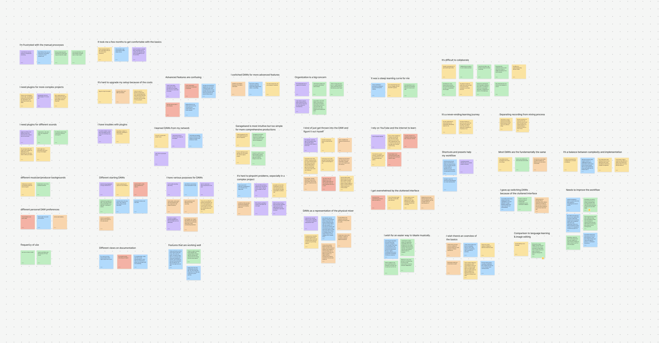 Survey results and an affinity map of lots of insights from interviews