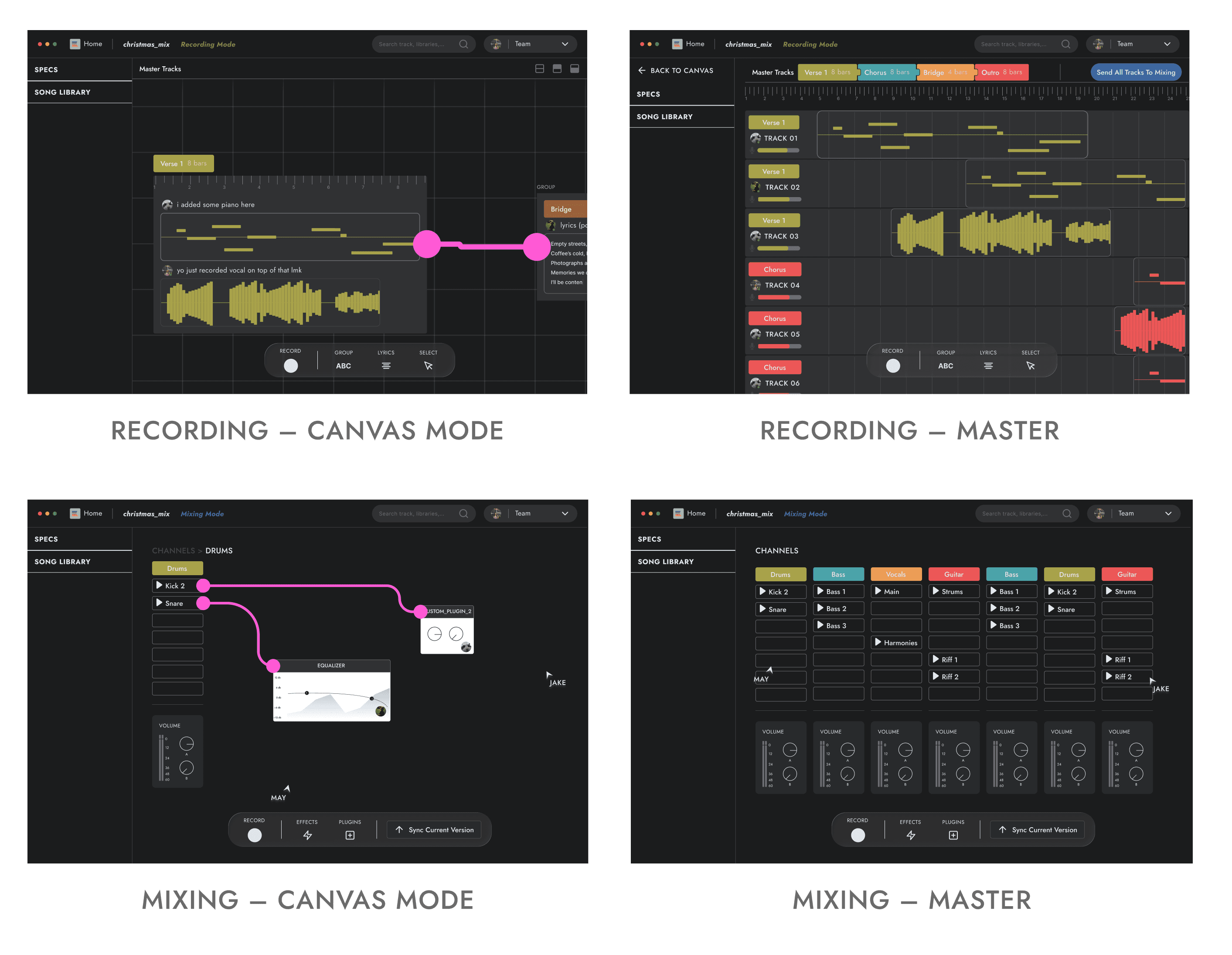 In the quest of challenging the traditional DAW interface pattern to replace with a more intuitive, I separated production apart from post-production. This created the challenge of connecting them together while keeping complex functionalities intact. The final 3 modes proved to be more intuitive for seeing this connection.