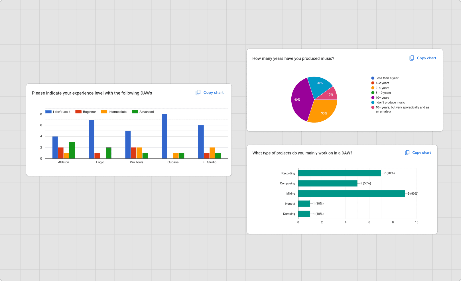 To investigate my hypothesis, I conducted a small survey with 10 musicians/producers with 5-10 years of experience and interviewed 6 of them.