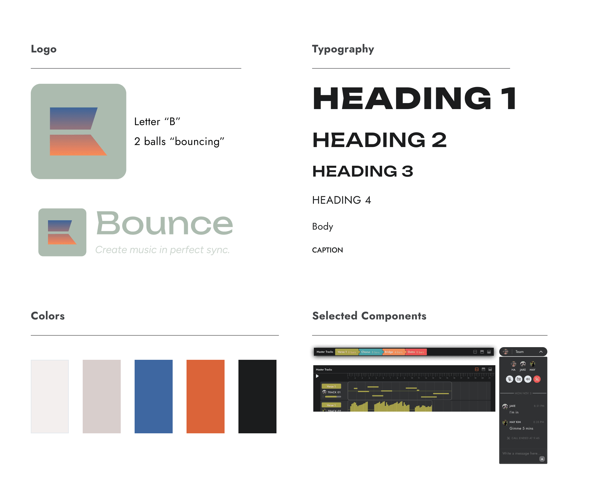I take inspirations from the feeling of the "zone" โ how we can get lost in the process of making music. This is why I gravitated towards the indie, ethereal vibe building โ to reminds users that Bounce are for bouncing human ideas. Additionally, I took the name "Bounce" from the common DAW button label when exporting the final product, and the act of "bouncing" ideas off of each other.