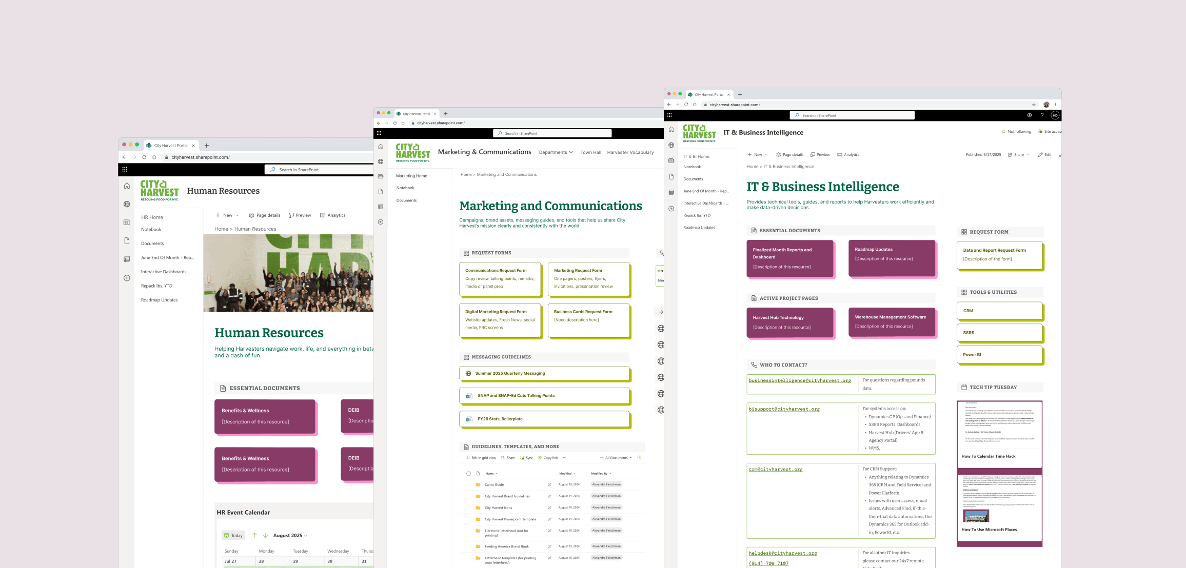 In 2021, City Harvest published its organization-wide SharePoint intranet with the hope that resource sharing would be centralized. However, the original design does not support this well.